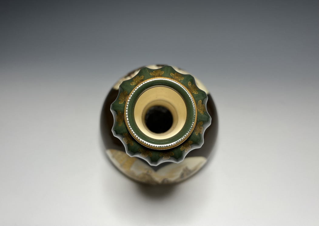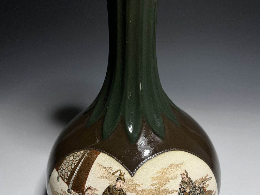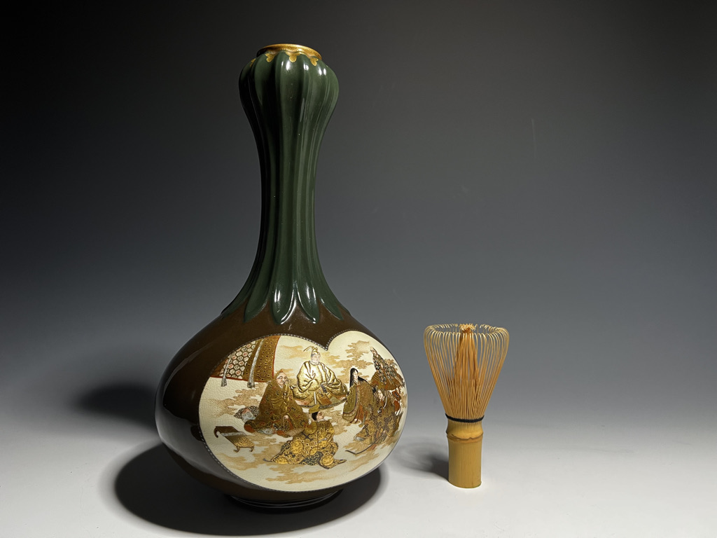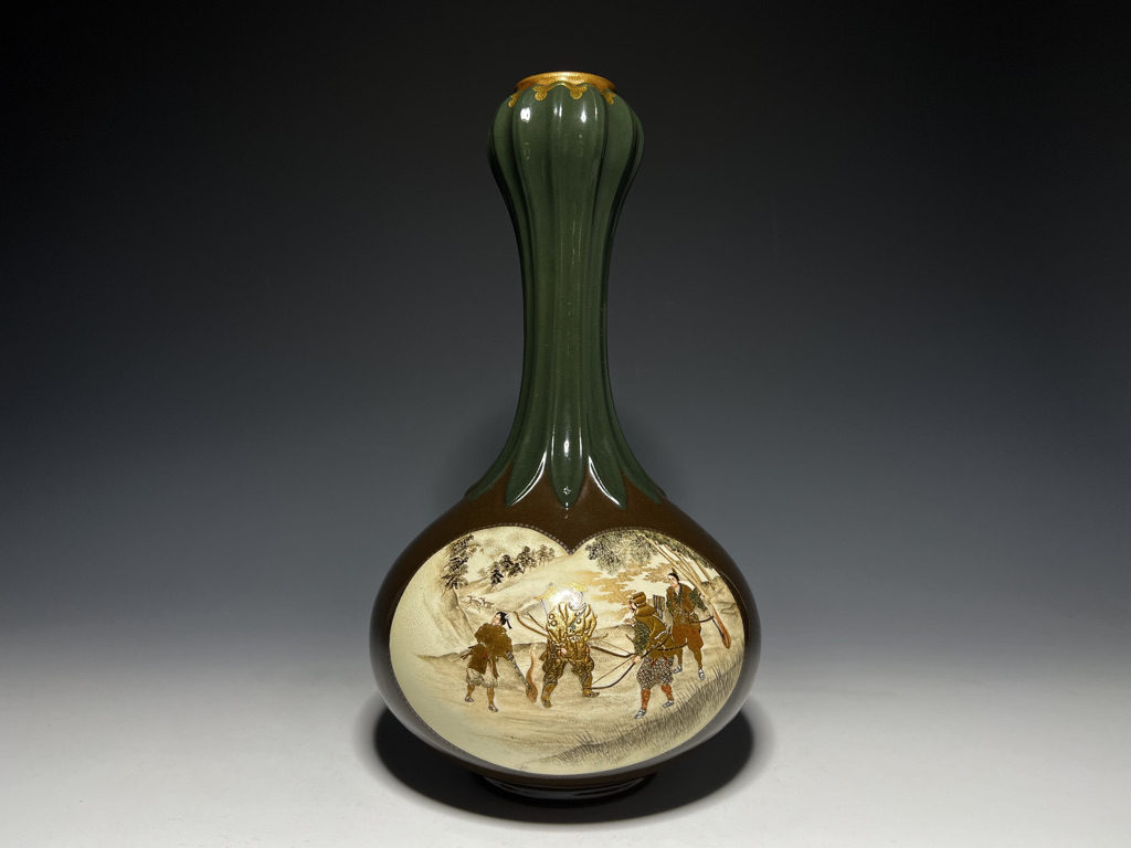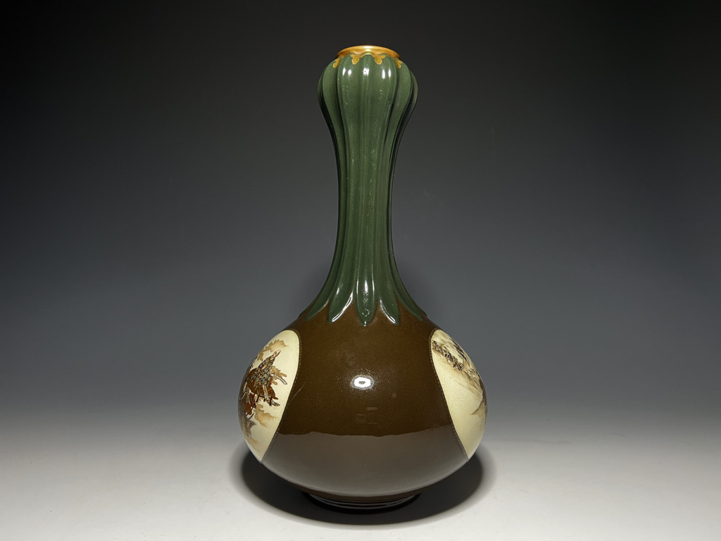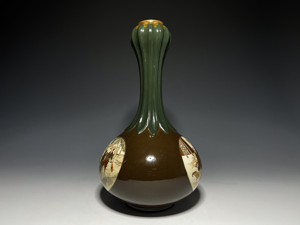 S010 錦光山造 茶釉金彩風俗文鶴首花瓶【SOLD】