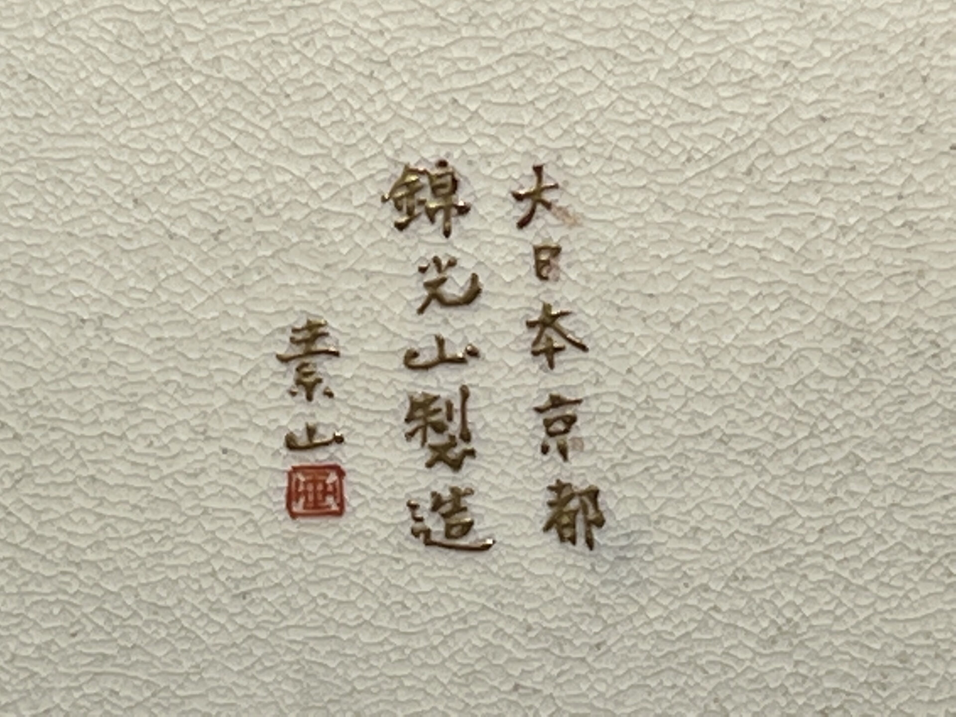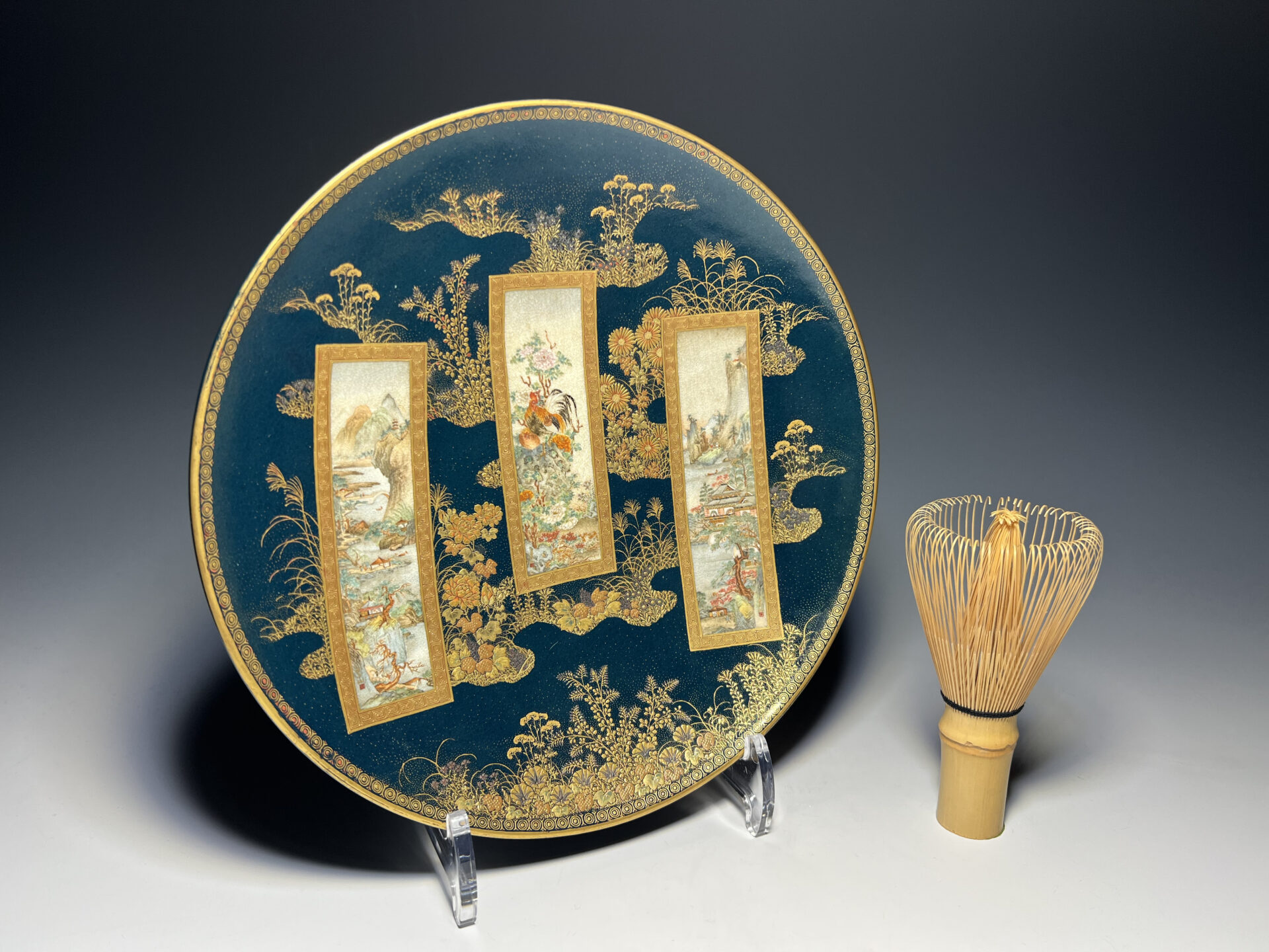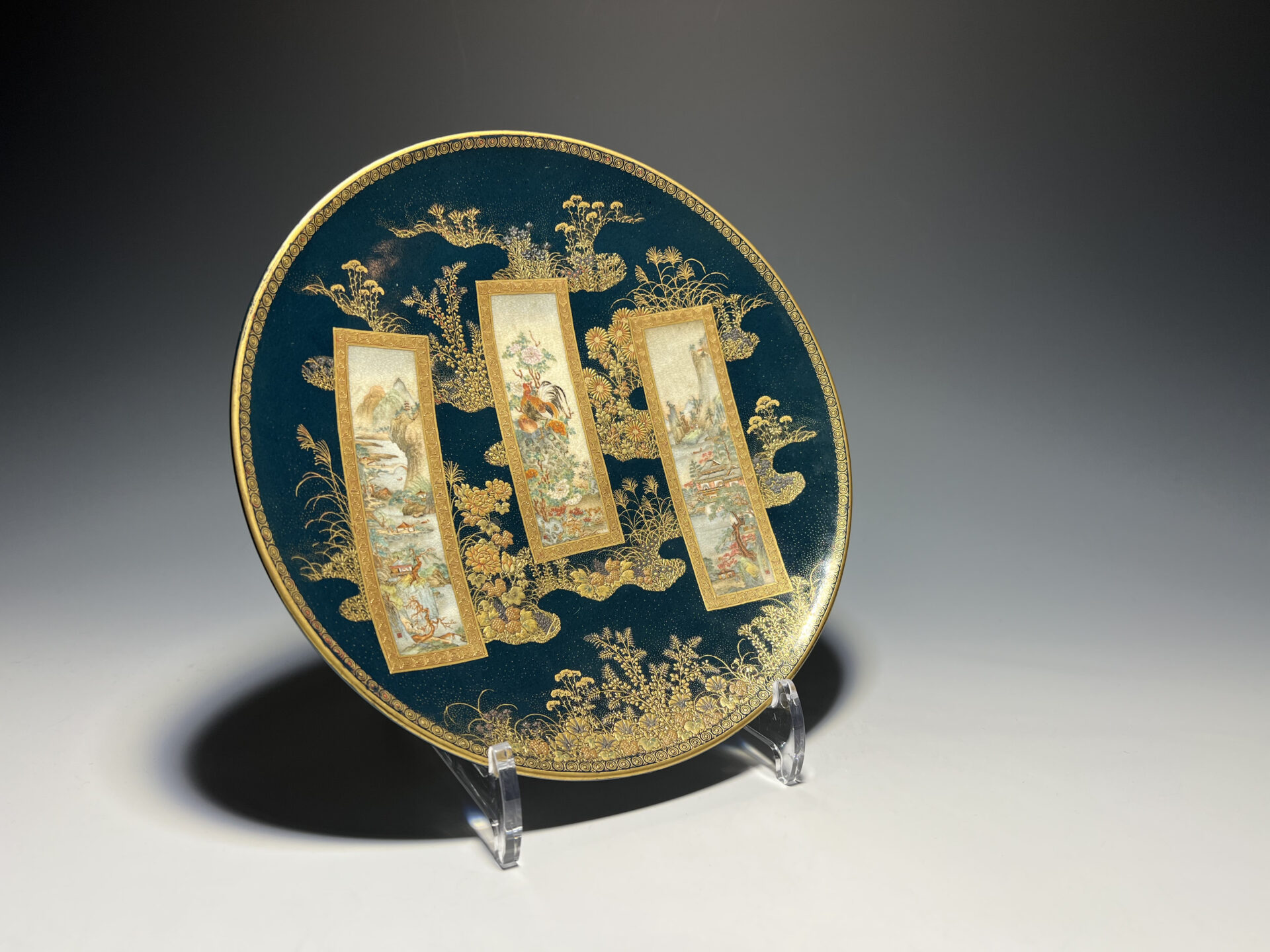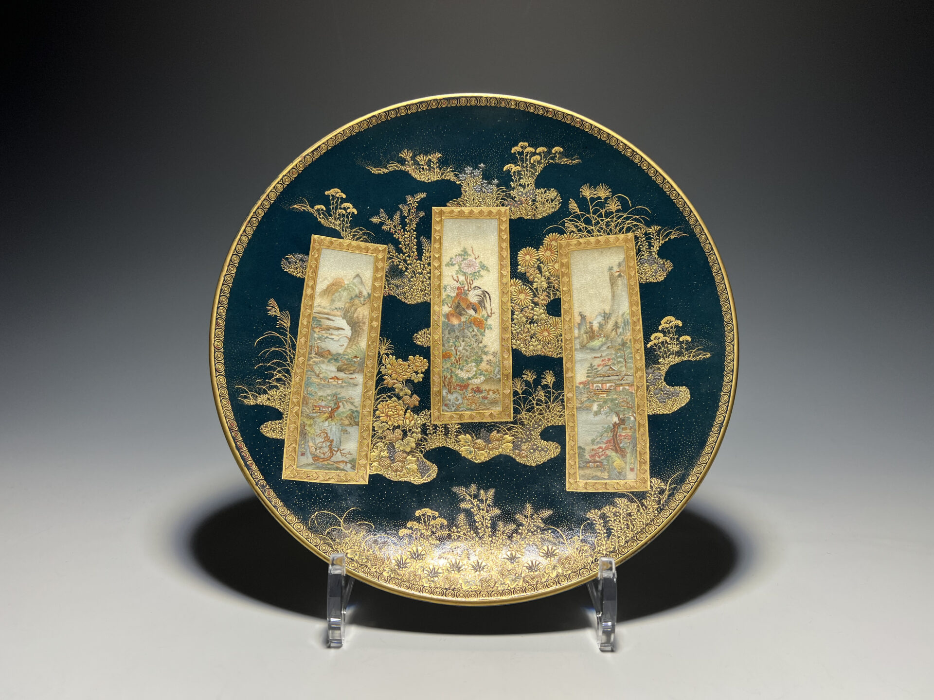 S019 錦光山造 素山画 緑釉金彩草花文風景図飾皿【SOLD】
