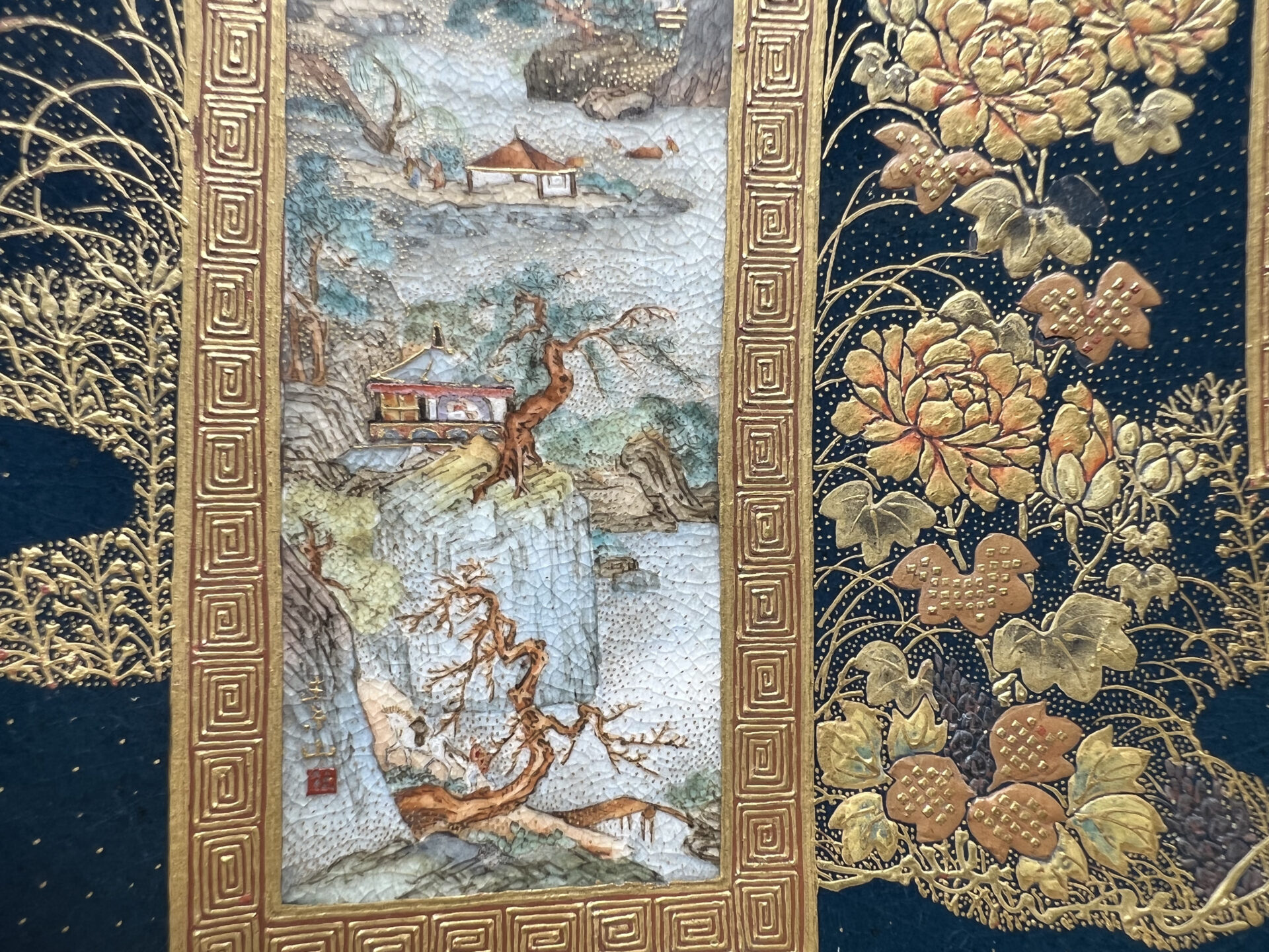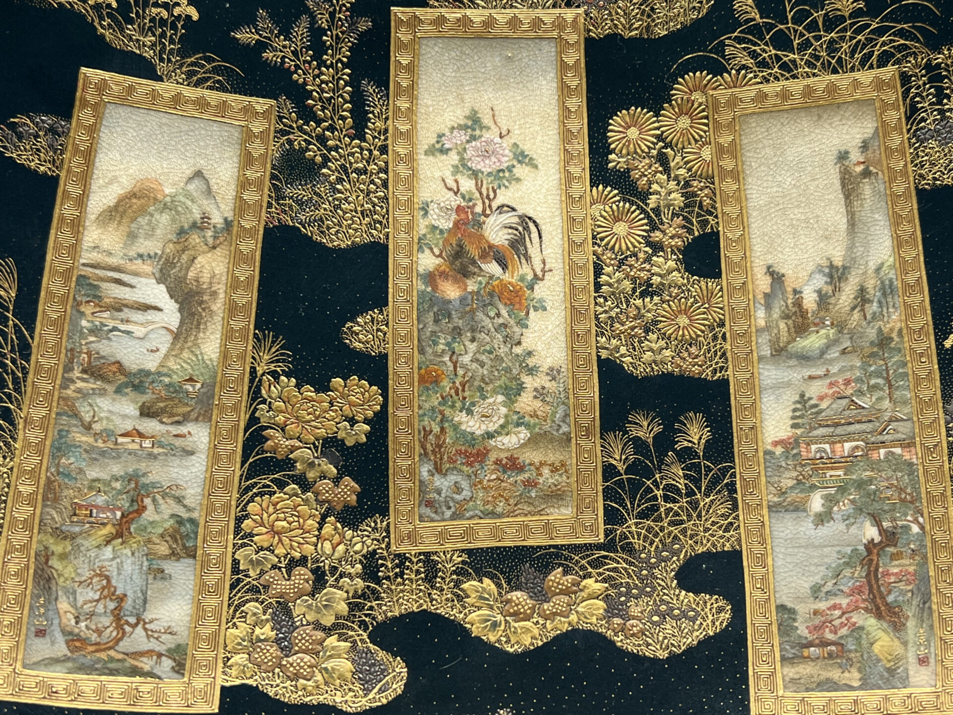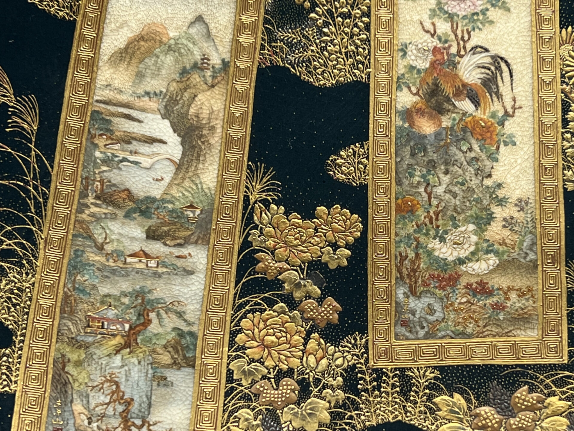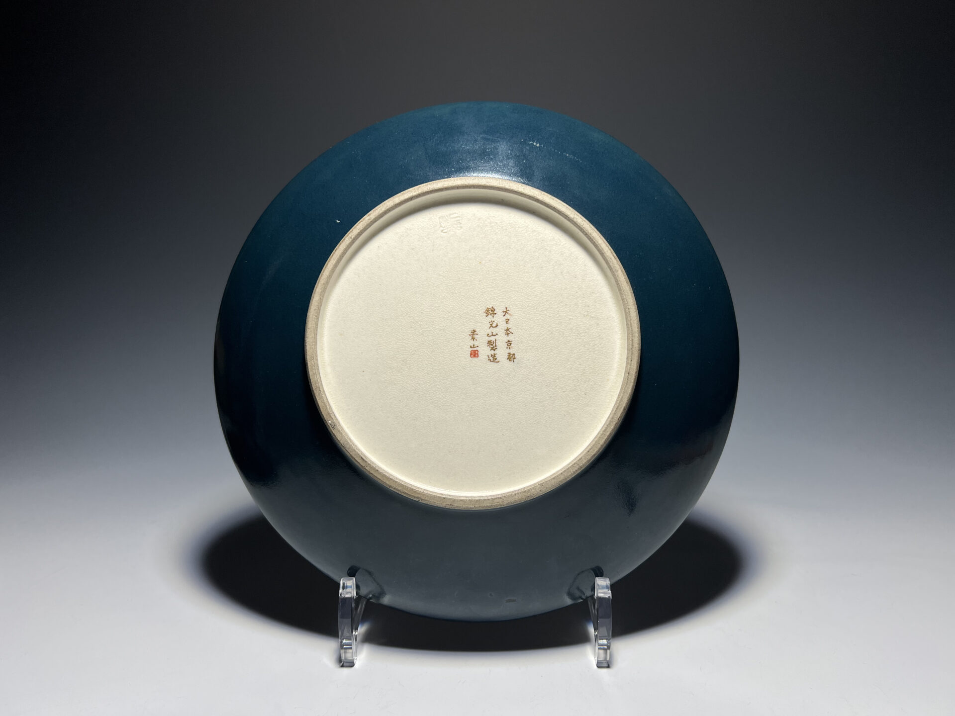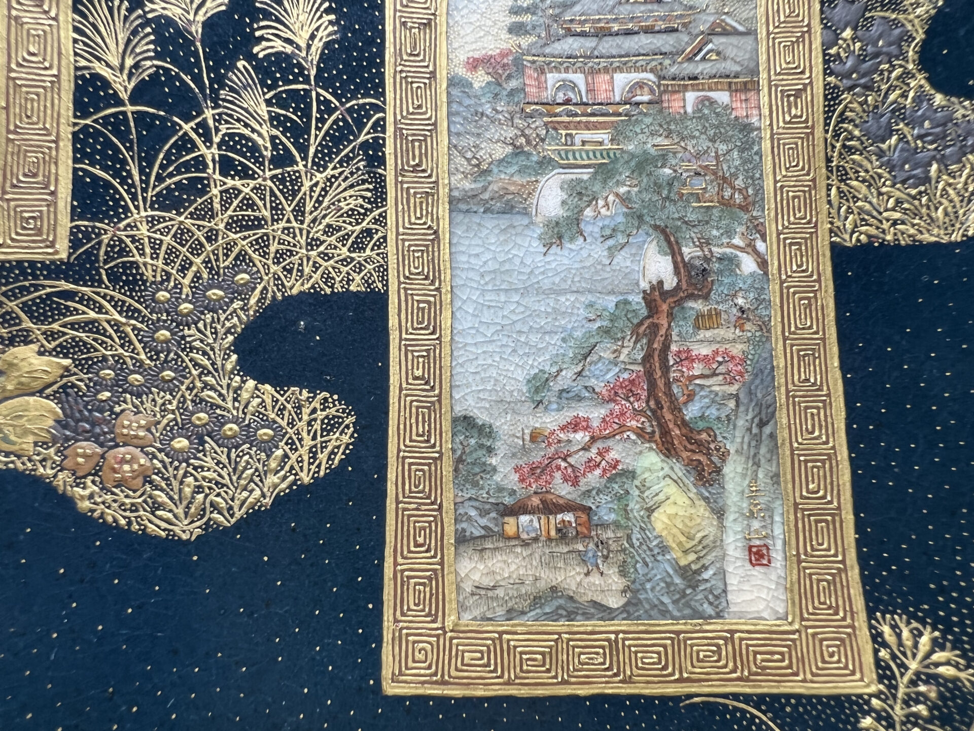 S019 錦光山造 素山画 緑釉金彩草花文風景図飾皿【SOLD】