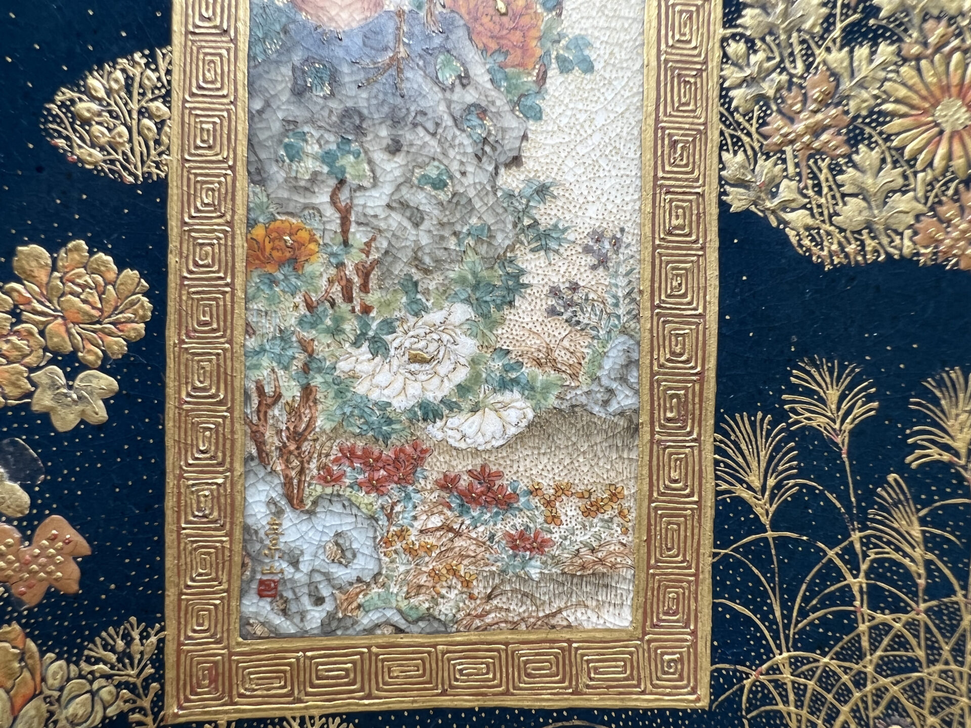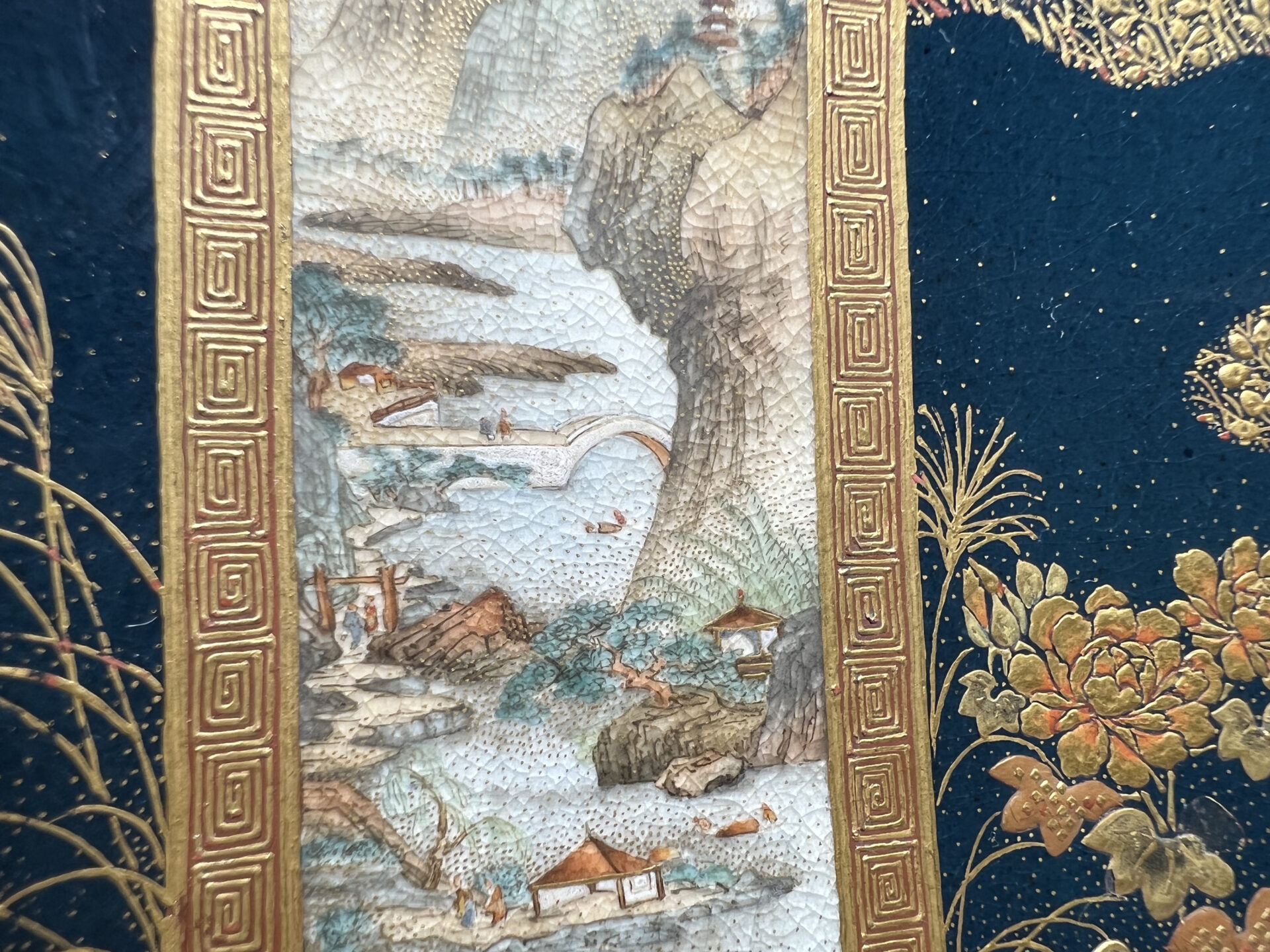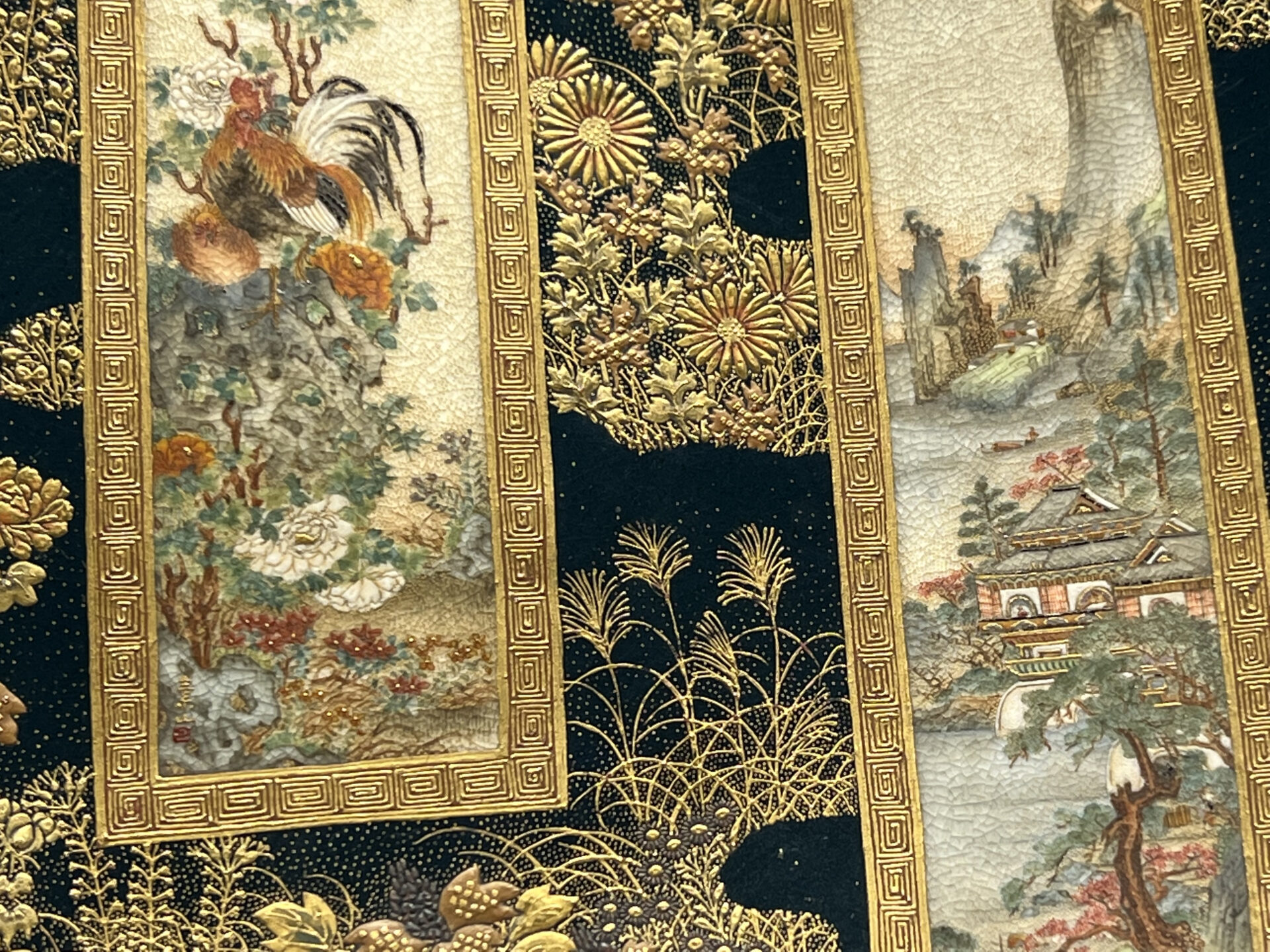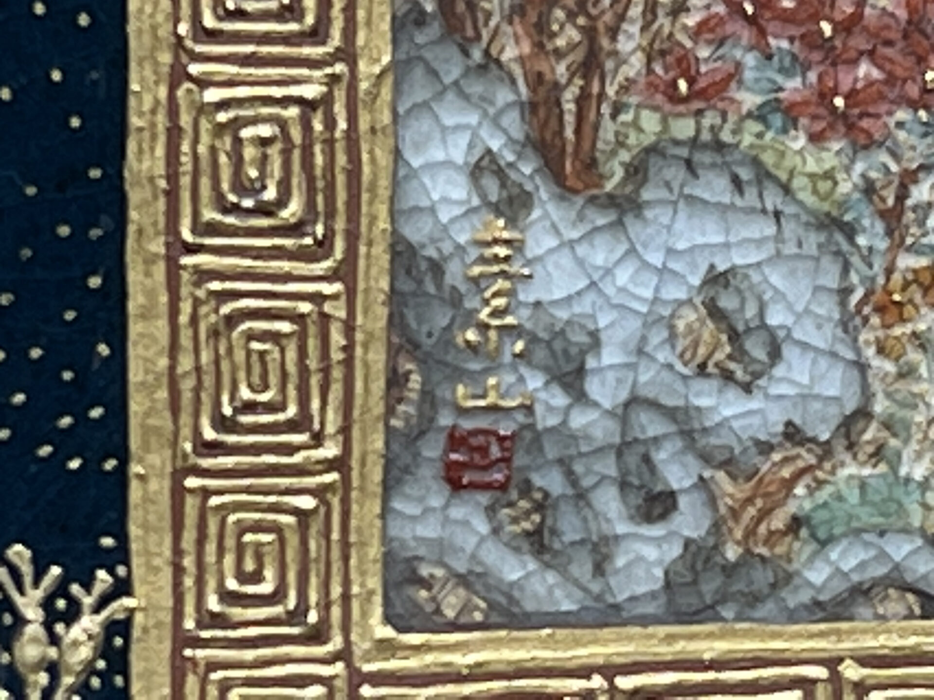 S019 錦光山造 素山画 緑釉金彩草花文風景図飾皿【SOLD】