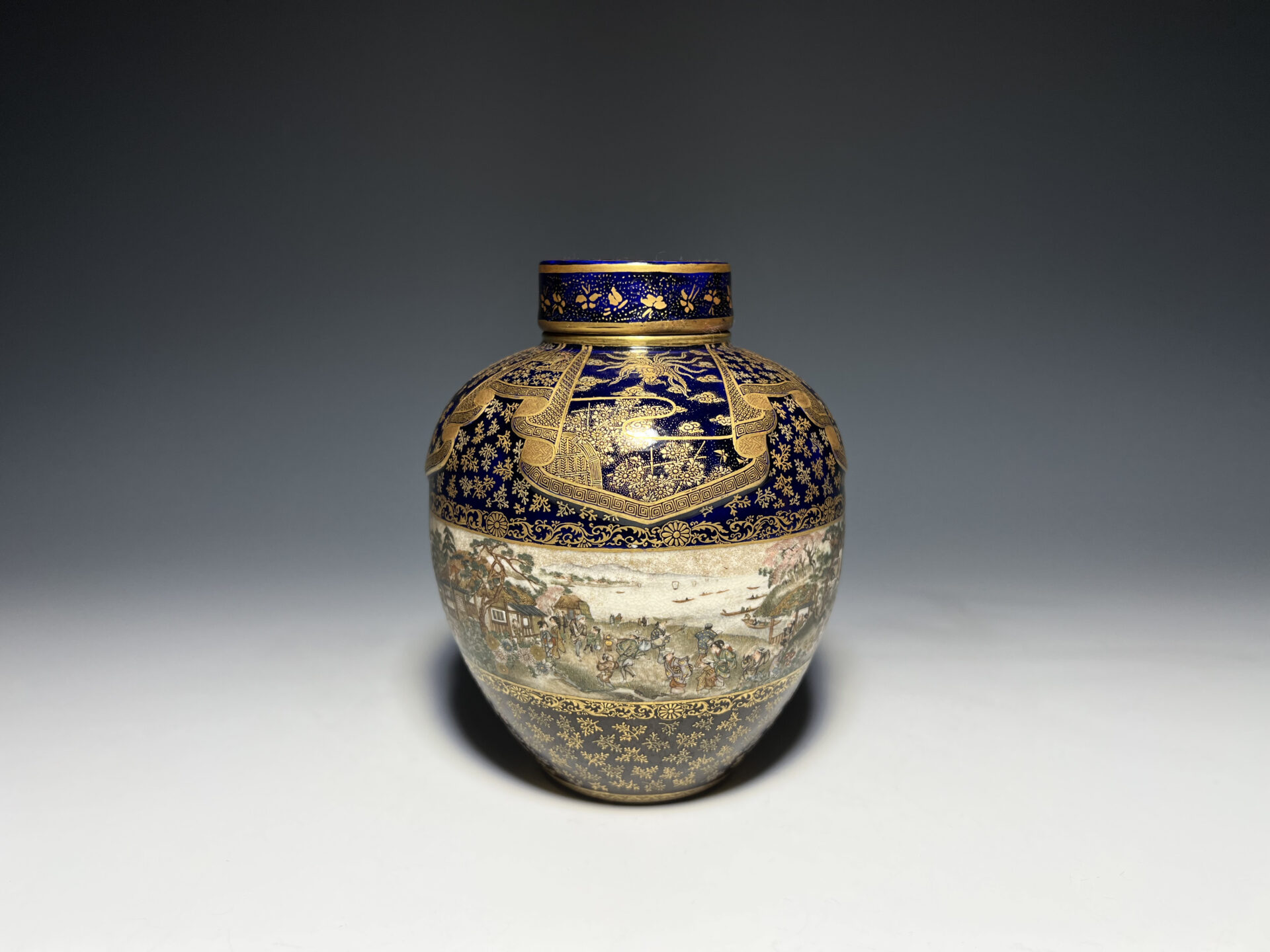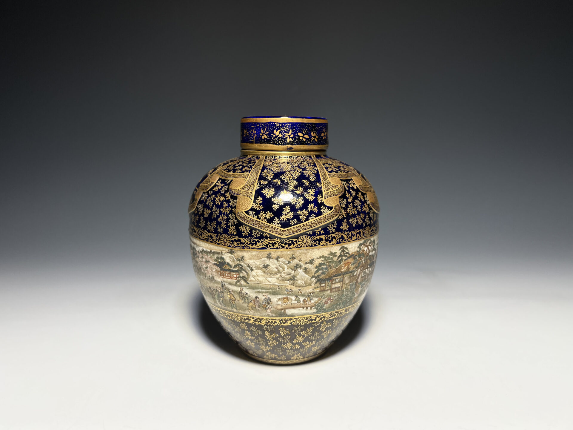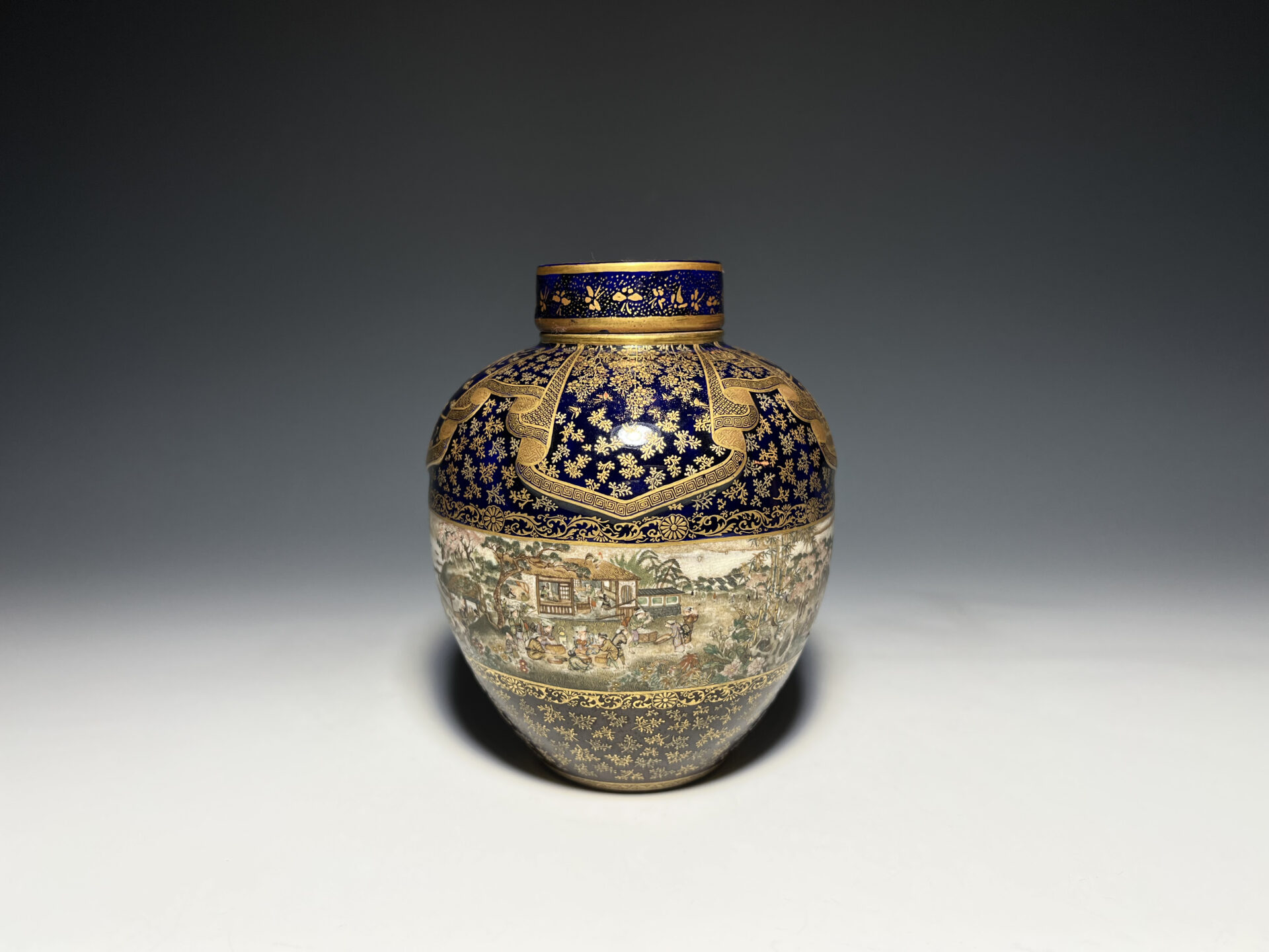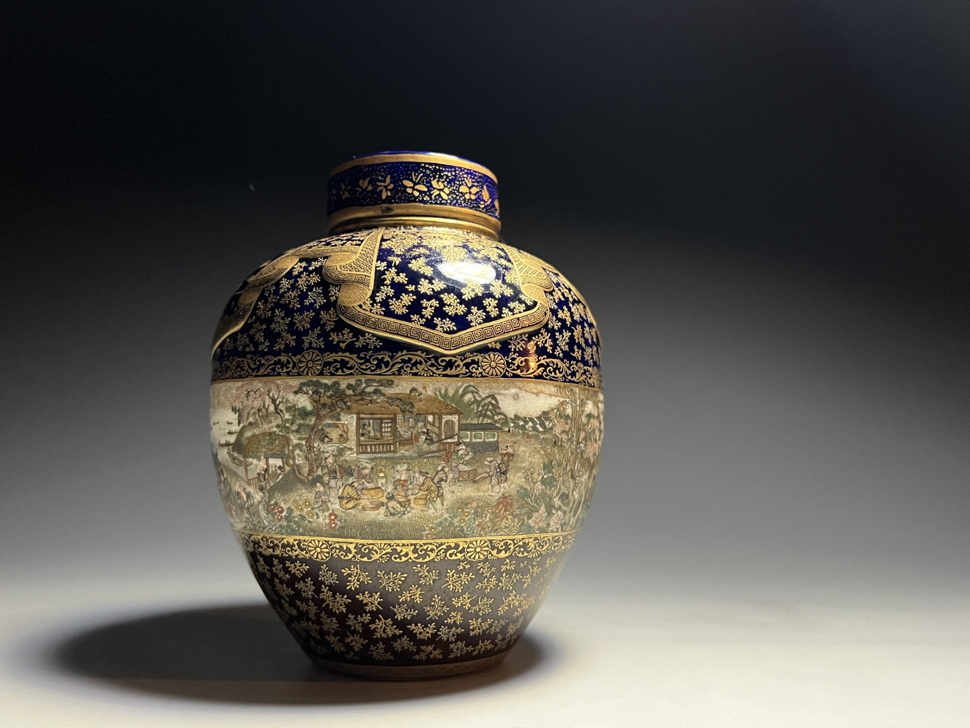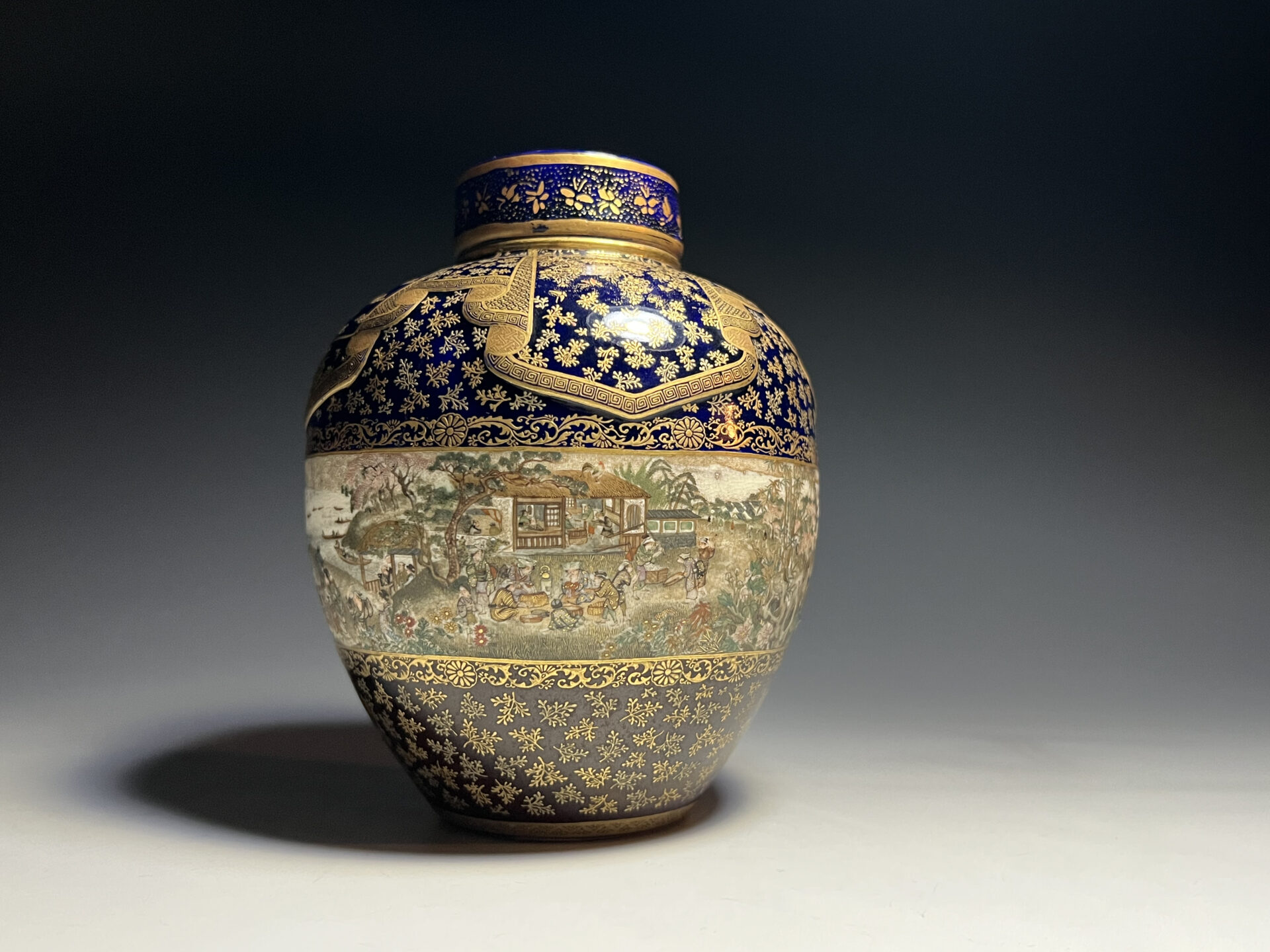 S024 京都錦光山造 瑠璃茶釉金彩文風俗図茶壺【SOLD】