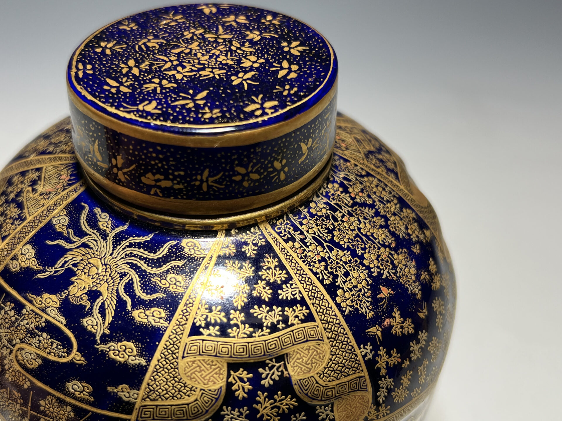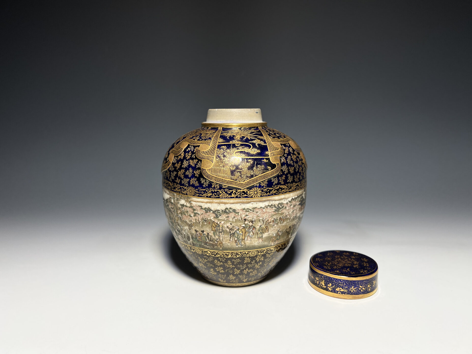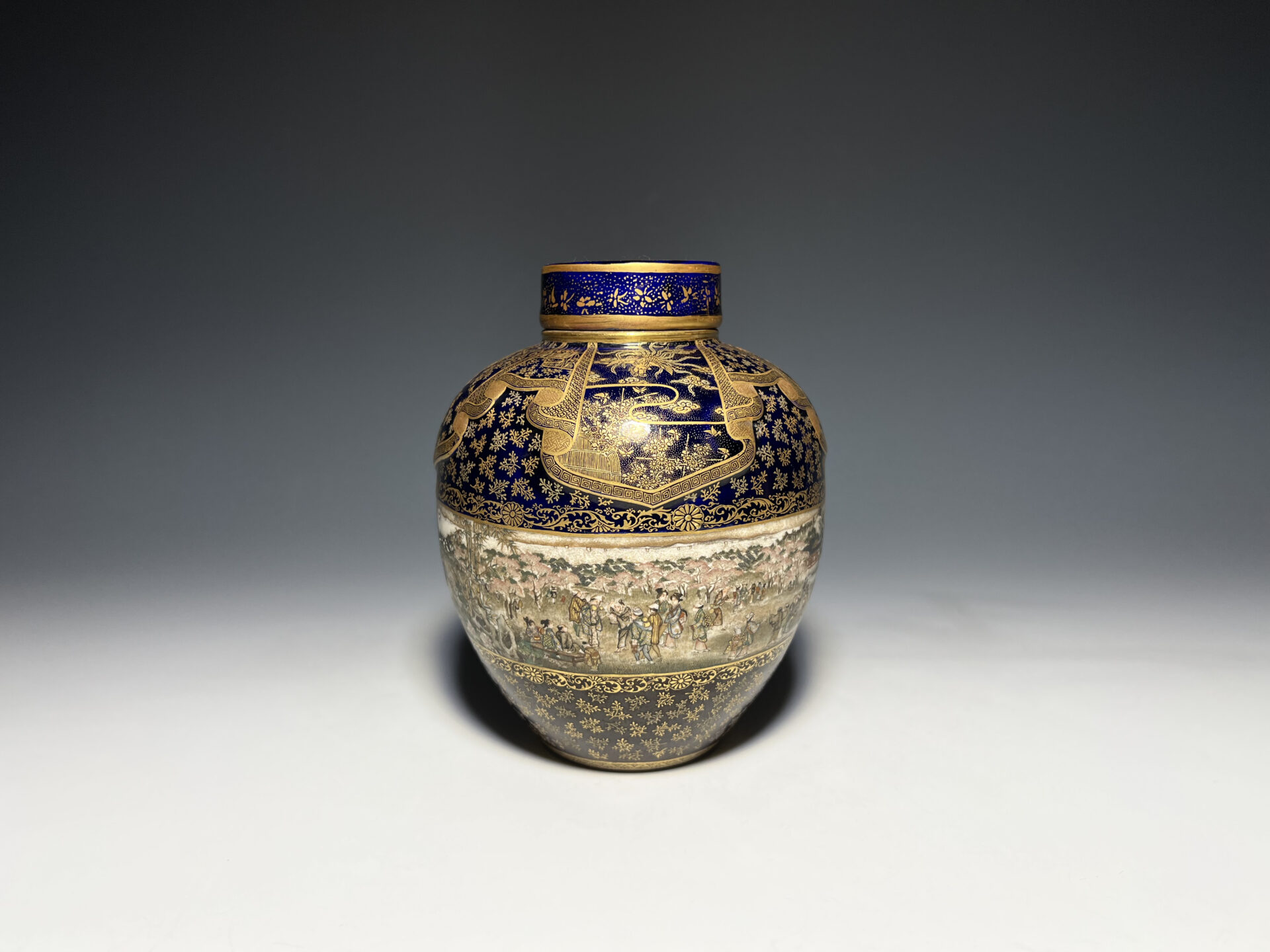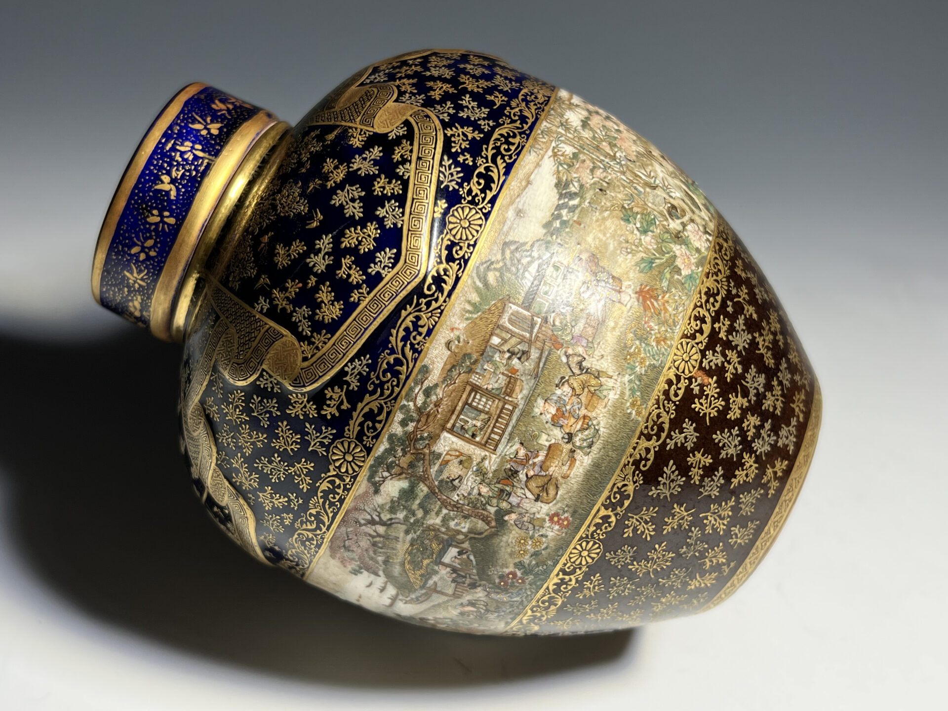 S024 京都錦光山造 瑠璃茶釉金彩文風俗図茶壺【SOLD】