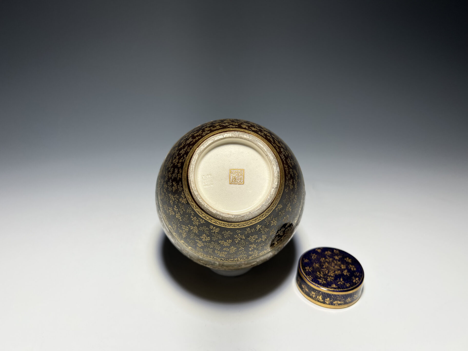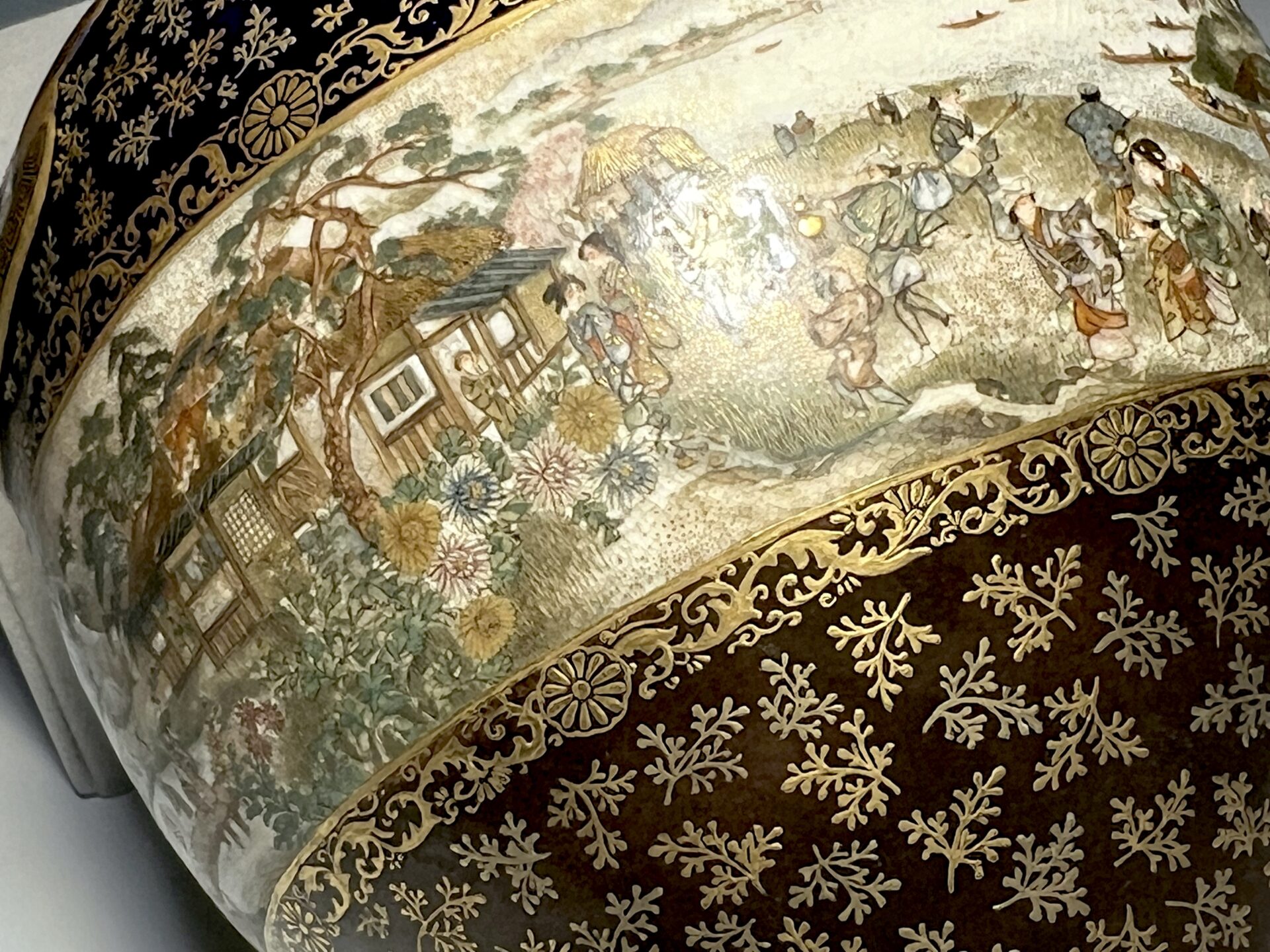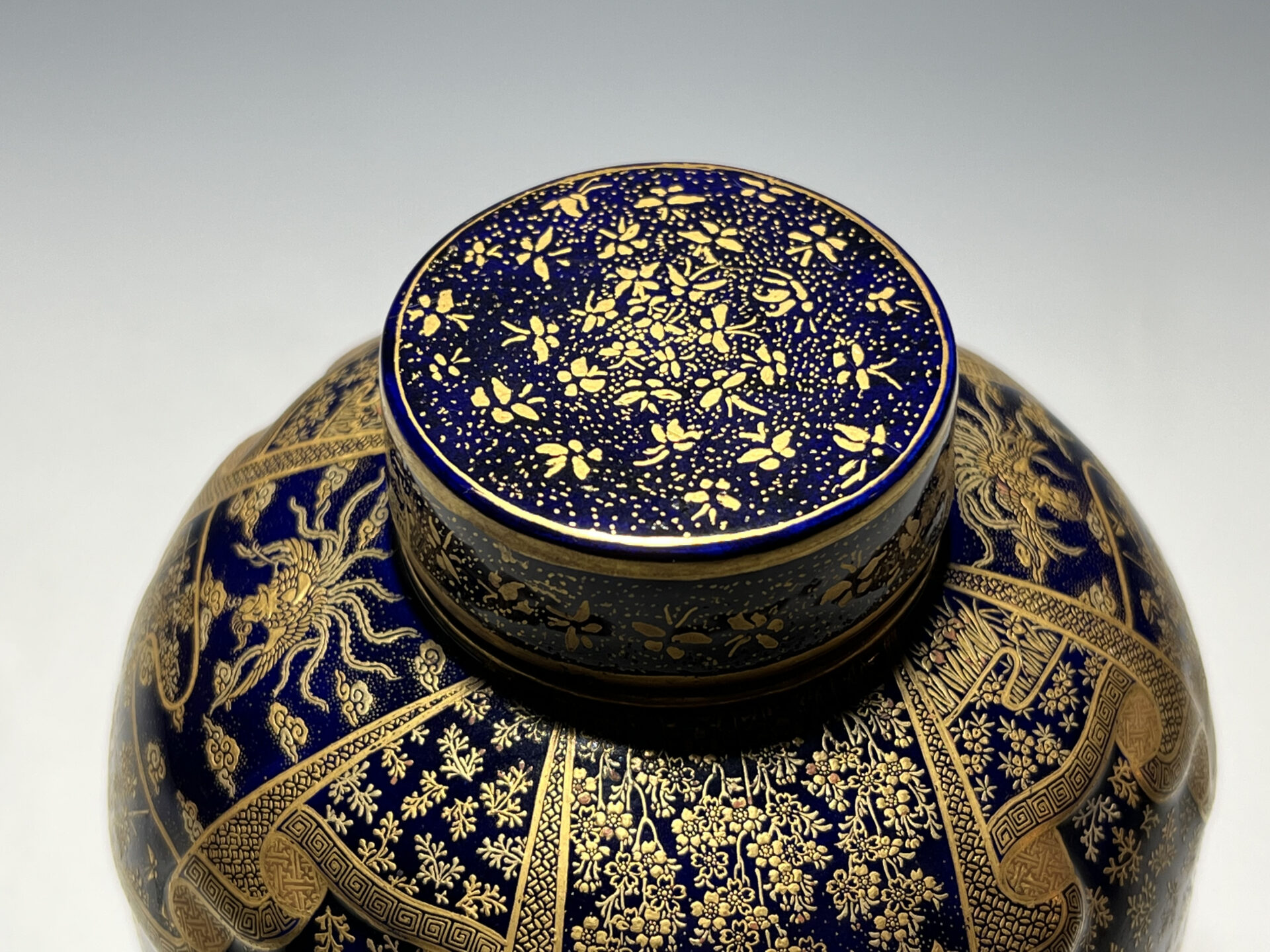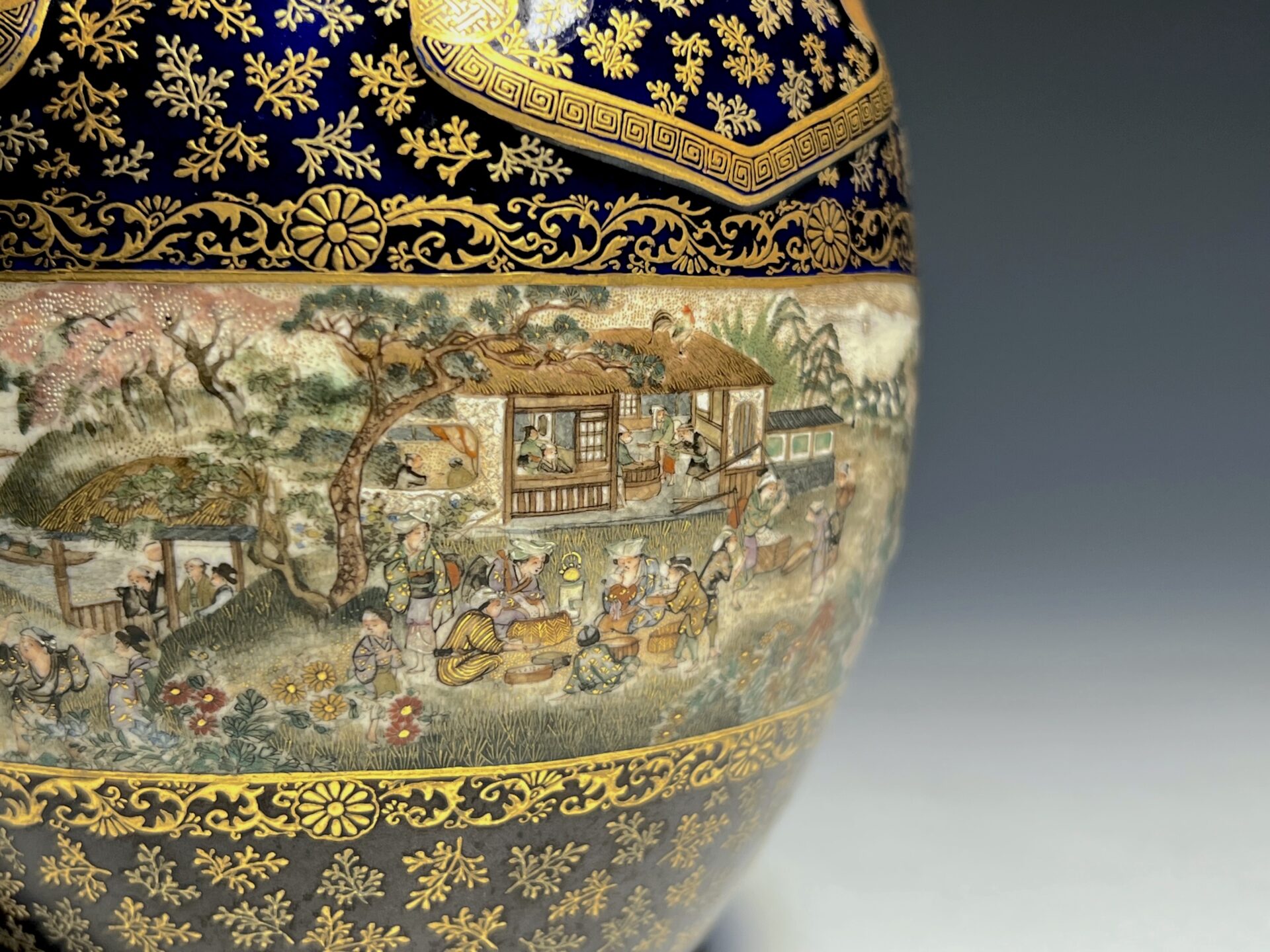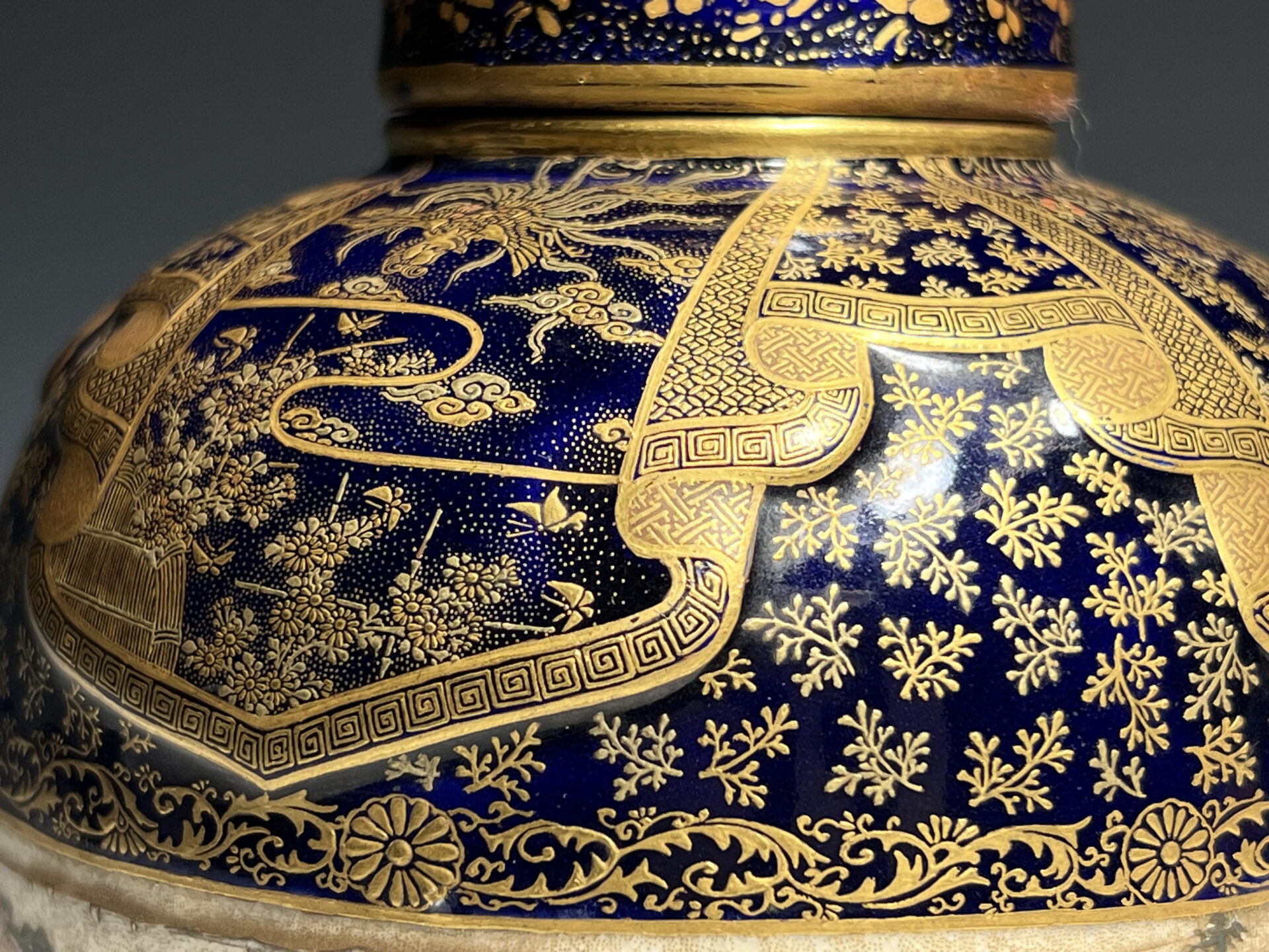 S024 京都錦光山造 瑠璃茶釉金彩文風俗図茶壺【SOLD】